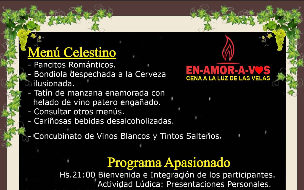 Desde el momento en que pones un pie en nuestro lugar, serás recibido con una cálida bienvenida que te hará sentir como en casa. Las luces suaves y las velas titilantes te guiarán hacia un ambiente íntimo y acogedor, donde el amor propio es el protagonista indiscutible de la velada. Nuestro Menú Celestino es una obra maestra culinaria, elaborada con ingredientes frescos y exquisitos sabores que despiertan tus sentidos y deleitan tu paladar. Desde los Pancitos Románticos que te dan la bienvenida hasta las exquisitas Picadas Alborotadas, o el Tatín de Manzana Enamorada con helado de vino patero engañado, que te sorprenderá al final con sus postres regionales, cada plato es una obra de arte gastronómica que te transportará a un estado de éxtasis culinario. Pero la experiencia va más allá de la comida. Durante la cena, serás acompañado por un escenario suave y romántico, que crea el ambiente perfecto para conversaciones íntimas y miradas cómplices. Las bebidas desalcoholizadas, cariñosamente preparadas, te refrescarán y te mantendrán hidratado mientras disfrutas de la velada, donde podrás maridar nuestros exquisitos platos con una selección de vinos blancos y tintos salteños, hasta la Caminata Enamorata o la Caminata Acuática. Cada momento está lleno de magia y romance. Al final de la noche, cuando regreses a la mesa después de tu romántico paseo, te despedirás con una foto digital de cortesía, un recuerdo tangible de una experiencia inolvidable. Y mientras te marchas, llevas contigo no solo los sabores y los momentos compartidos, sino también un profundo sentido de amor propio y conexión con tu ser interior.